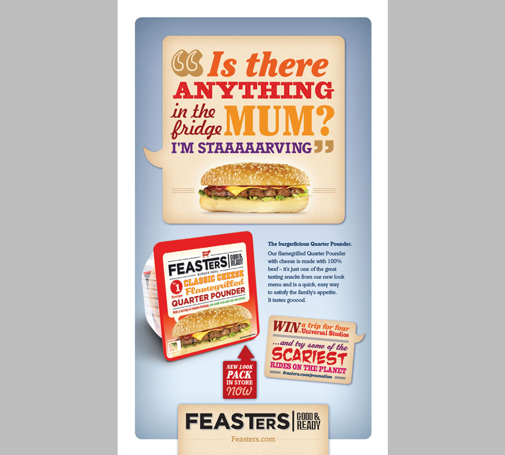 Feasters’ key differentiator in the microwaveable snack market was its use of ‘100% quality’ ingredients. Working with an art director, I was tasked with making the Feasters range as attractive as possible to students and mums – quite a feat considering the ‘dirty’ reputation of microwaveable food.