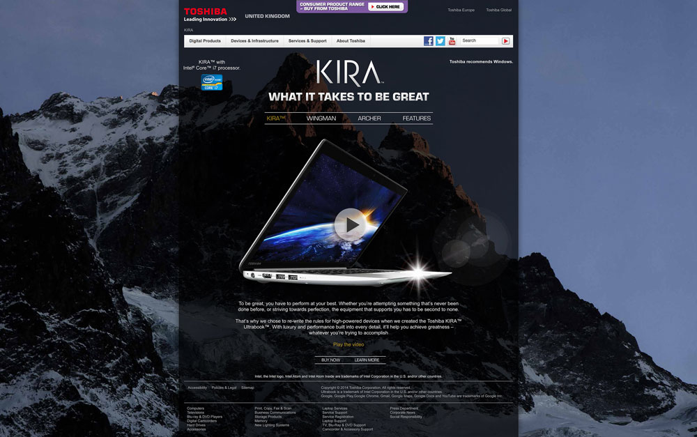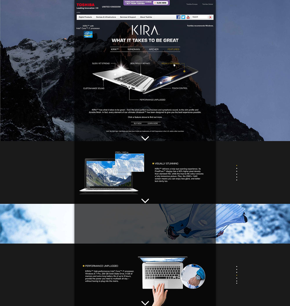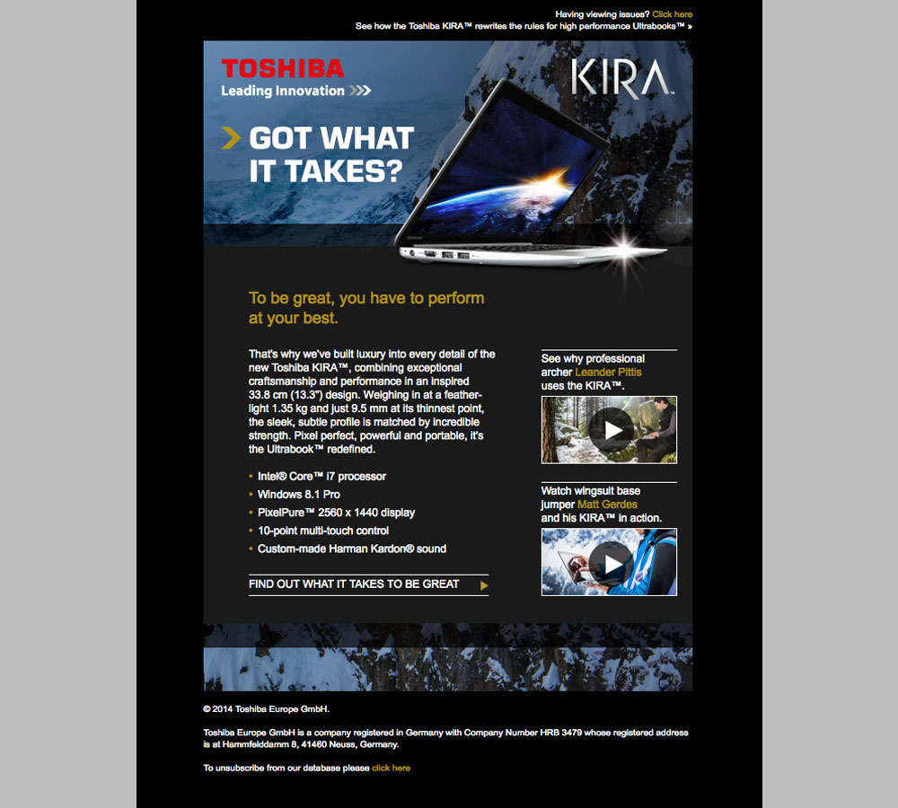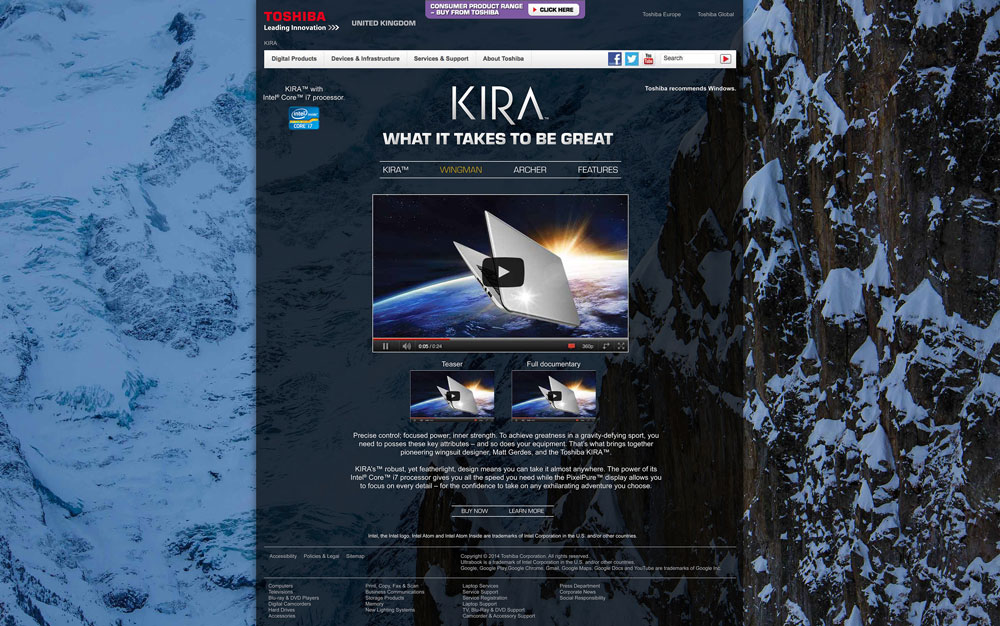 As Toshiba’s most premium laptop, the Kira is all about helping users to perform at their best. I included a series of campaign films, showing the relationship between extreme sportsmen and their Kira laptops, to write and art direct a slick online campaign around them.